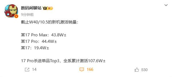 据博主数码闲聊站透露的信息,这次Pro系列成了支柱,17 Pro Max、17 Pro两款销量均突破了40万。